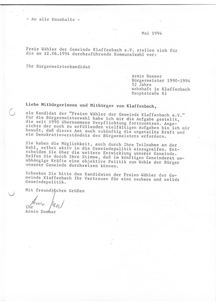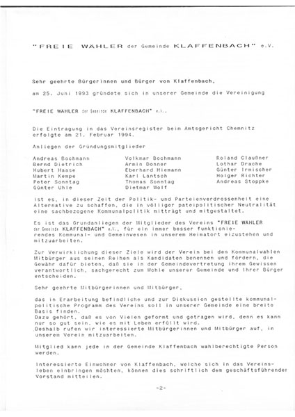 Wir sahen uns dieses Schauspiel nicht sehr lange an. Schon bald reifte der Entschluss, unsere Kräfte ausschließlich auf Klaffenbach zu konzentrieren. Im Jahr 1993 traten wir geschlossen aus der DSU aus. Am 25. Juni 1993 gründeten wir die Vereinigung "FREIE WÄHLER der Gemeinde KLAFFENBACH" e.V., welche am 18. Februar 1994 beim Amtsgericht Chemnitz unter der Nummer 1250 in das Vereinsregister eingetragen wurde. Seither beschränken sich unsere erfolgreichen politischen Tätigkeiten allein auf Klaffenbach.