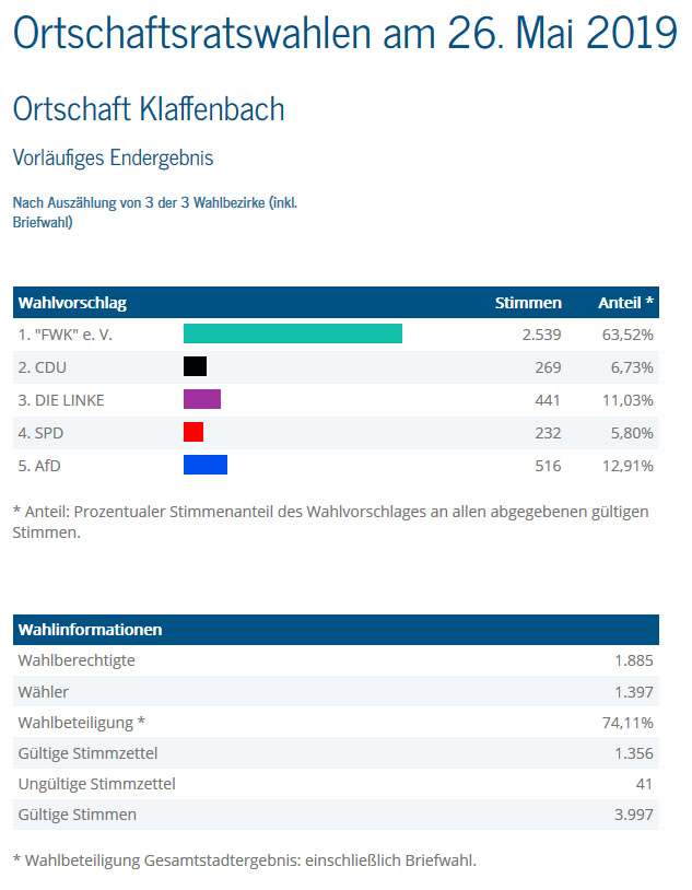 Ein historisches Wahlergebnis für die Freien Wähler Klaffenbach. Vielen Dank allen Wählerinnen und Wählern für die Unterstützung. Wir halten Sie weiter auf den Laufenden.